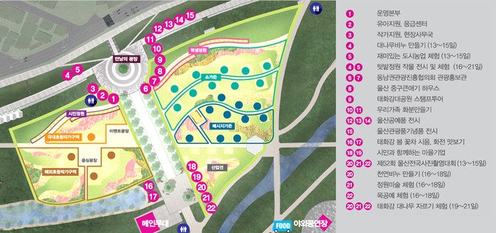 또한, 푸드트럭(5대), 화장실(6동), 포토존(4곳), 쉼터(다수), 음수대(2개소)를 설치 운영하고 미아, 분실물, 부상 등 긴급상황 발생 시 신속히 대처하기 위해 응급의료센터가 운영된다.