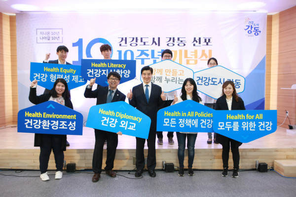 강동구는 9일 오후 2시 구청 대강당에서 주민, 학계 전문가, KHCP 회원도시 등 200여명과 함께 ‘건강도시 강동 선포 10주년 기념식’을 개최했다. 사진은 행사에서 구청장 및 관계자들이 기념촬영을 하는 모습. (사진제공=강동구청)