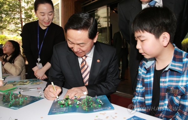 김상곤 사회부총리 겸 교육부 장관이 10일 오전 독도교육주간을 맞아 서울 서대문구 독도체험관을 방문, 학생들과 독도 모형을 만들고 있다.