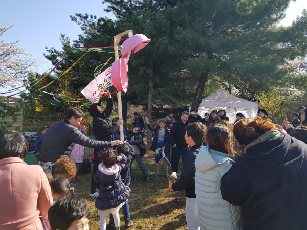 경기 안산시 선부3동은 지난 7일 달미공원에서 주민 500여명이 참여한 가운데 ‘복사꽃 오감피크닉 축제’를 성황리에 마쳤다. 사진은 주민들이 박터트리기 게임을 하고 있는 모습. (사진제공=안산시청)