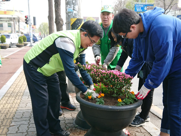 경기 수원시 팔달구 매교동에서는 지난 9~10일 양일에 걸쳐 20여명이 정조로 마을정원에 화분을 설치 작업을 하고 봄꽃을 심어 봄단장을 했다. 사진은 관계자들이 꽃을 심고 있는 모습. (사진제공=팔달구청)