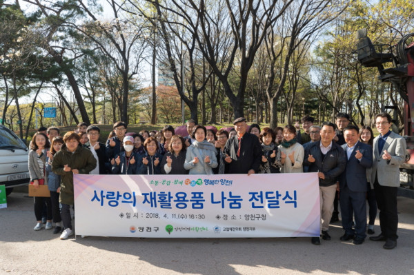 양천구가 11일 오후 4시30분 양천공원에서 ‘사랑의 재활용품 나눔 전달식’을 개최했다. 직원들이 수집한 재활용품들은 지역내 양천지역자활센터와 고엽제 전우회 양천지부에 전달됐다. 사진은 구청 직원들이 기념촬영을 하는 모습. (사진제공=양천구청)