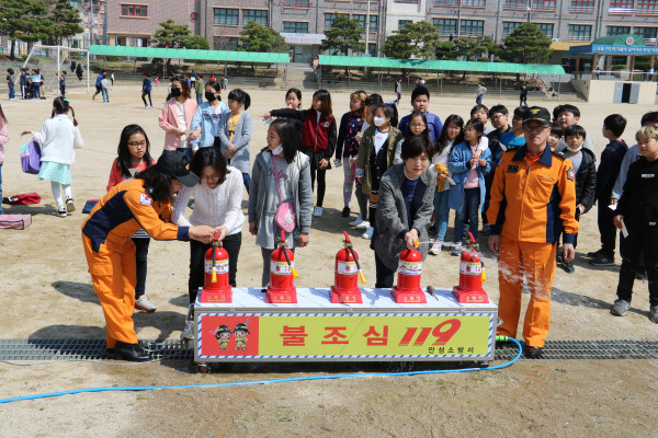 경기 안성소방서가 공도·안성초등학교 어린이들을 대상으로 각종 재난으로부터의 어린이들의 대처능력을 키워낸다는 취지에서 ‘어린이 눈높이 소방안전교육’을 실시했다. 사진은 행사에 참석한 교사·학생들이 소화기 분무 체험을 하는 모습. (사진제공=안성소방서)