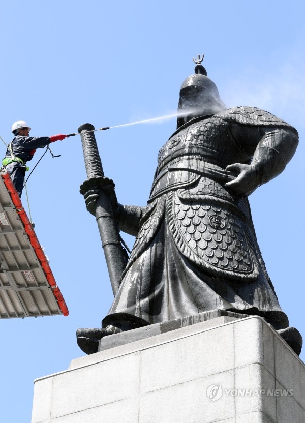 2일 오후 서울 광화문 광장에서 서울시 관계자들이 이순신 동상을 세척하고 있다.