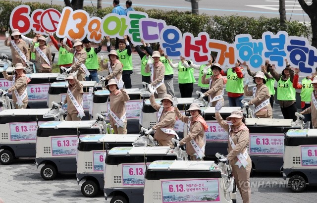 12일 오후 부산 남구 대연문화공원에서 열린 우리 동네 코코 발대식에서 야쿠르트 아주머니들이 지방선거 홍보 캠페인을 펼치고 있다. '코코'는 한국야쿠르트의 배달용 탑승카로 이번 지방선거의 선거일 등이 표기된 현수막을 부착하고 동네 구석구석을 누빌 예정이다.