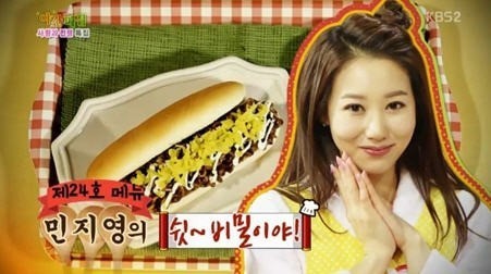 일일 셰프로 변신한 민지영은 빵, 짜장라면, 단무지, 마요네즈 등을 이용해 ‘쉿 비밀이야’를 완성해냈다. '쉿 비밀이야'를 맛 본 출연자들은 "불고기 버거 맛이 난다", "느끼하다가도 단무지가 느끼함을 잡아준다", "질투 날 정도로 맛있다"며 호평을 아끼지 않았다.