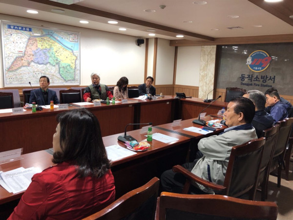 서울 동작소방서는 지난 12일 오후 2시 소방서 소회의실에서 지역내 전통시장 16곳과 동작구청 관계자가 참여한 가운데 전통시장 화재예방 간담회를 가졌다. 사진은 참여자들이 회의하고 있는 모습. (사진제공=동작소방서)