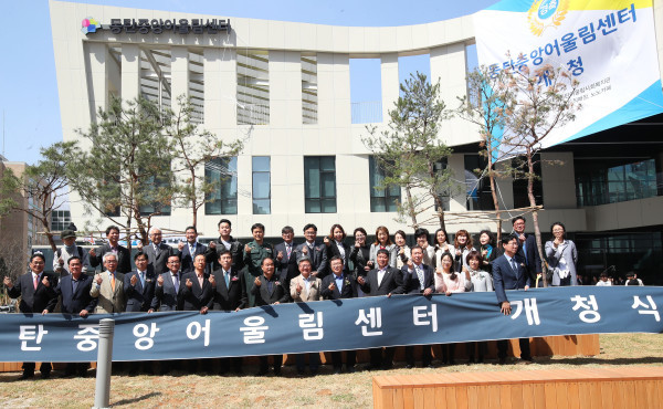 경기 화성시가 지난 11일 관계자 및 시민 등 300여명이 참석한 가운데 ‘동탄중앙어울림센터’개청식을 개최했다. 센터는 2015년부터 23개월간 총 사업비 498억원이 투입돼 지하 1층~지상 3층 규모로 조성됐다. 사진은 센터 개청을 기념해 관계자들이 기념촬영을 하고 있는 모습. (사진제공=화성시청)
