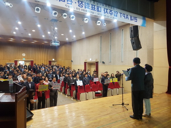 서울 강남구가 최근 대치2문화센터 강당에서 지역 내 아파트 176개단지 관리소장 및 입주자대표 200여명이 참석한 가운데 폐비닐 등 재활용쓰레기 수거에 대한 설명회를 개최했다. 사진은 참석자들이 재활용품 분리수거 실천 결의를 다지고 있는 모습.(사진제공=강남구청)