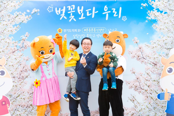 정기열 경기도의장이 도의회 주관 '벚꽃보다 우리~' 현장이벤트에 참석해 도의회 SNS캐릭터인 소민·소원이, 아이들과 함께 사진을 찍고 있다. (사진제공=경기도의회)