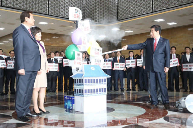 자유한국당 김성태 원내대표 등 참석 의원들이 16일 오후 국회 본관 로텐더홀에서 댓글공작 등을 규탄하는 퍼포먼스를 벌이고 있다.