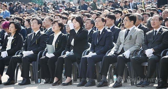 더불어민주당 추미애 대표(왼쪽부터), 바른미래당 유승민 공동대표, 민주평화당 조배숙 대표, 정의당 이정미 대표, 장완익 사회적참사 특별조사위원회 위원장, 더불어민주당 우원식 원내대표, 정의당 노회찬 원내대표 등이 16일 오후 경기도 안산시 단원구 안산 화랑공원 내 야외광장에서 열린 4.16세월호참사 희생자 정부 합동 영결추도식에 참석하고 있다.