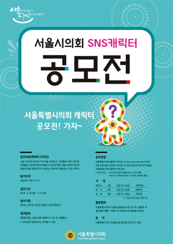 [시민일보=이진원 기자] 서울시의회가 오는 5월15일까지 서울시민과 적극 소통하고, 의정홍보의 차별화로 경쟁력을 높인다는 취지에서 ‘서울시의회 SNS캐릭터 시민 공모전’을 진행한다.