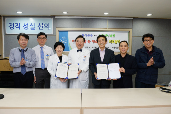 동대문구는 16일 서울성심병원과 ‘한부모 가정 등 청소년 지원’ 의료 협약을 체결했다. 이번 협약은 민간단체·기관 및 구민의 자산을 활용해 소외계층의 복지문제를 해결하는 프로그램이다. 사진은 병원 및 구청 관계자가 기념촬영을 하는 모습. (사진제공=동대문구청)
