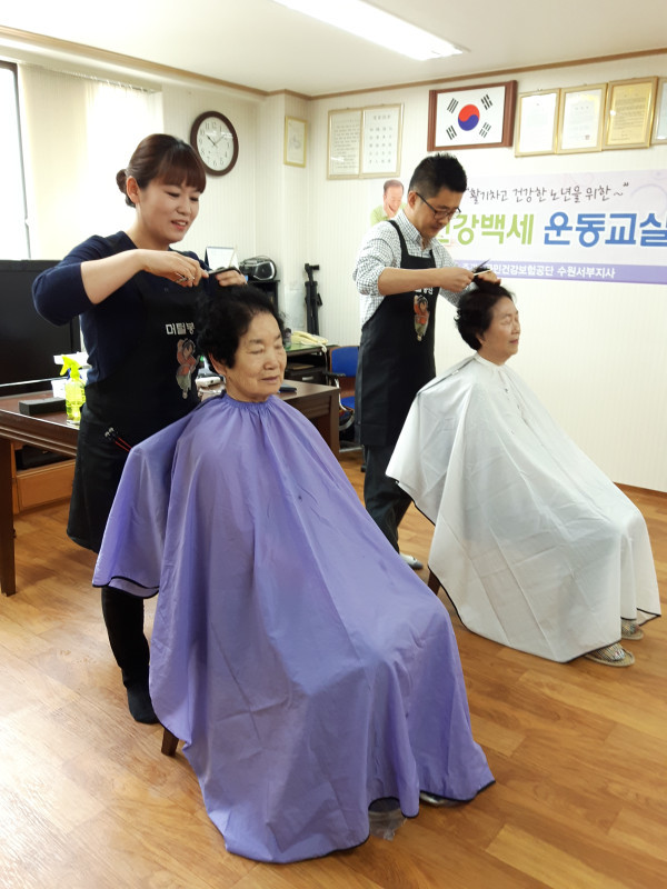 경기 수원시 권선구 곡선동은 지난 13일 '머털도사 봉사단'과 함께 지역내 65세 이상 노인을 대상으로 이·미용 봉사활동을 했다. 사진은 참여자들이 노인의 머리를 손질하고 있는 모습. (사진제공=권선구청)