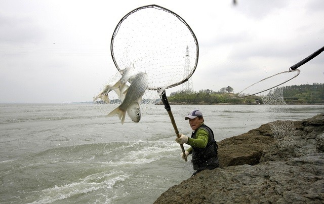 | ▲ 땅끝 해남 우수영 명량해협의 거친 물살을 헤치며 지나가는 숭어를 뜰채로 들어올리고 있는 어부(사진) | ||