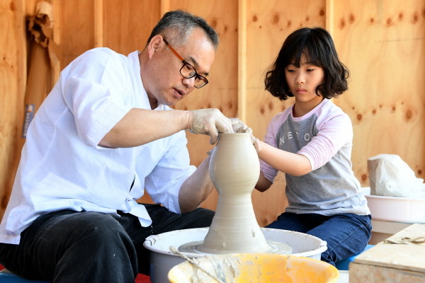 | ▲ 한 어린이가 도자기 장인과 함께 도자기 만들기 체험을 하고 있다. | ||