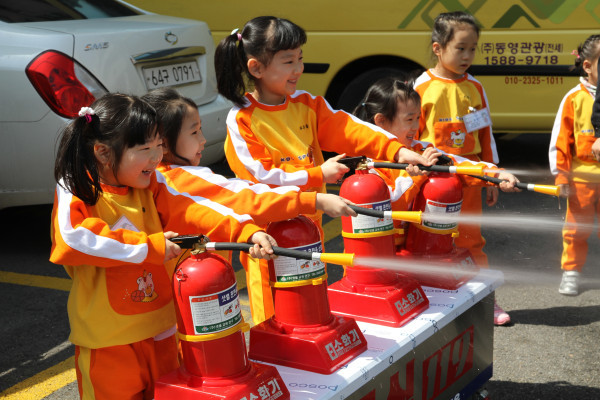 관악소방서는 18일 오전 소방서 3층 안전체험교실 및 후정에서 푸른솔어린이집 원생 30여명을 대상으로 소방안전체험교실을 운영했다. 사진은 교육에 참여한 어린이들이 소화기 사용 실습을 하고 있는 모습. (사진제공=관악소방서)
