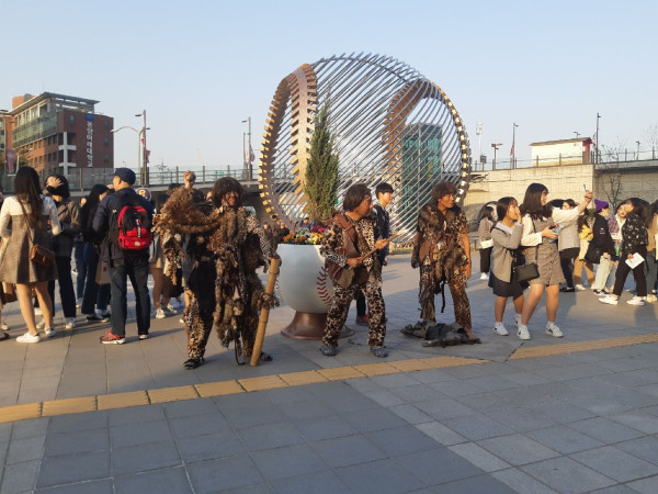 경기 연천군은 18일 오후 6시30분 고척 스카이돔에서 펼쳐진 '넥센히어로즈- NC다이노스 전'에서 제26회 연천구석기축제 홍보를 위해 ‘연천군스폰서데이’행사를 개최했다. 사진은 구석기인들로 분장한 연기자들이 경기장 앞에서 축제 홍보 퍼포먼스를 하고 있는 모습. (사진제공=연천군청)