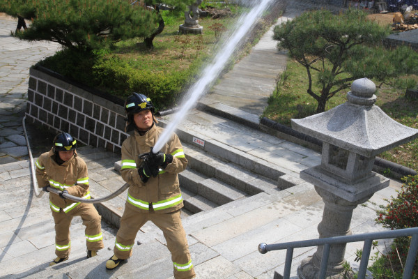 동작소방서는 19일 서달산 일대에서 봄철 산불 예방 캠페인 및 유관기관 합동 현지적응 훈련을 실시했다. 사진은 소방관들이 소방호스를 이용해 화재를 진압하는 훈련을 진행하는 모습.(사진제공=동작소방서)