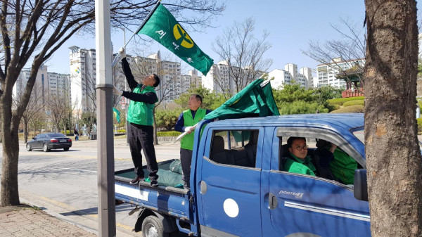 새마을지도자동두천시협의회 회원 9명은 최근 중앙로 새마을회관주변에 새마을기 200개와 새마을회관 외 8곳에 새마을운동 제창 제48주년 기념 및 제8회 새마을의 날 기념 현수막을 게시했다. 사진은 회원들이 새마을기를 게시하고 있는 모습.(사진제공=동두천시청)