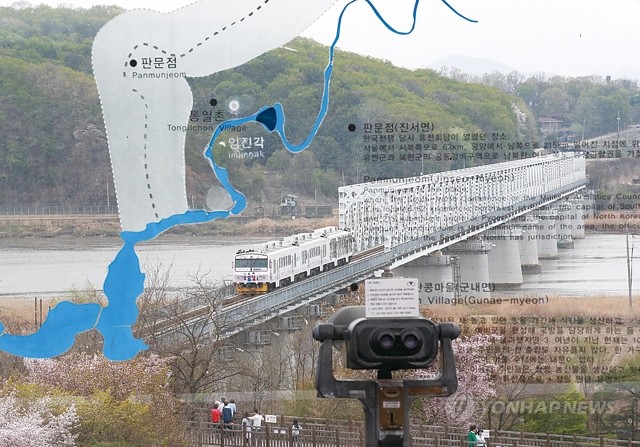 남북정상회담을 닷새 앞둔 22일 경기도 파주 임진각 전망대에서 바라본 자유의 다리 너머로 DMZ 평화열차가 도라산역을 향해 가고 있다.