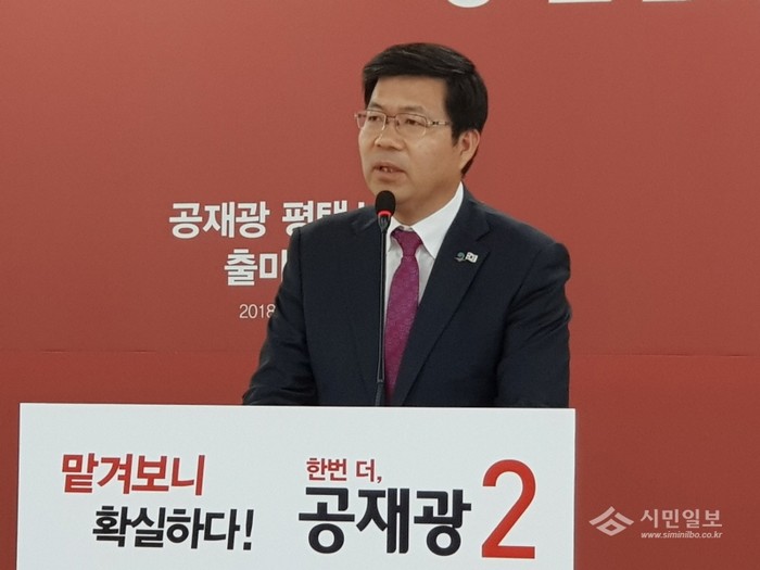 공 예비후보는 이날 기자회견에 앞서 ‘2018’ 4행시를 통해 “이번에도 공재광을 한번더 일할 수 있도록 당선시켜 8년의 중단 없는 전진을 이룰 수 있도록 도와 달라”고 호소했다.