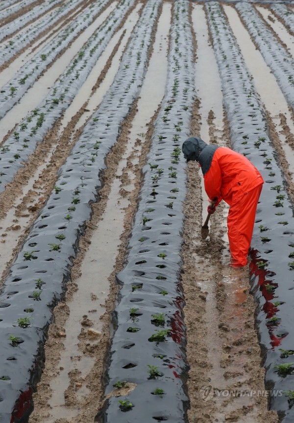 강원지역에 단비가 내리는 23일 오전 춘천시 서면의 감자밭에서 한 농업인이 물꼬를 정비하고 있다.