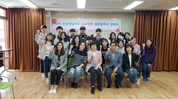 경기 오산매홀고등학교는 지난 21일 교내 예술융합교실에서 지역내 8개 고등학교에서 최종 선발된 신규 동아리 회원 17명과 지도교수 및 교사 등이 참석한 가운데 ‘2018년 오산혁신교육지구 고교연계 연극동아리 입학식’을 개최했다. 사진은 관계자들이 입학식 후 기념촬영을 하는 모습. (사진제공=오산시청)