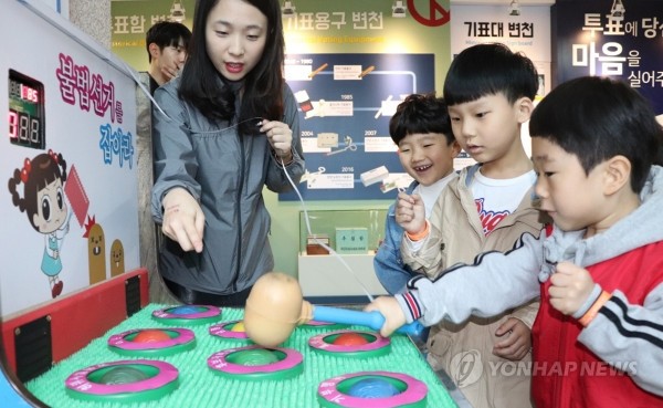 24일 전북 전주시 완산구 전북도선거관리위원회에서 '민주주의발전소'가 개관한 가운데 어린이들이 '불법선거를 잡아라' 두더지 게임을 하고 있다.