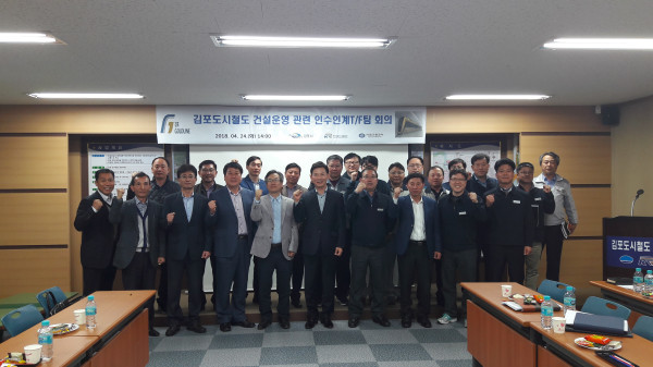 경기 김포시가 김포도시철도건설사업의 노반공사부터 단계적으로 인수인계 TF팀을 구성해 24일 회의를 진행했다. 이날 회의에서 준공 및 인수인계가 효율적이고 원활하게 이루어 질 수 있도록 유지관리 방안을 토의했다. 사진은 첫 회의를 기념해 TF팀이 기념촬영을 하는 모습. (사진제공=김포시청)