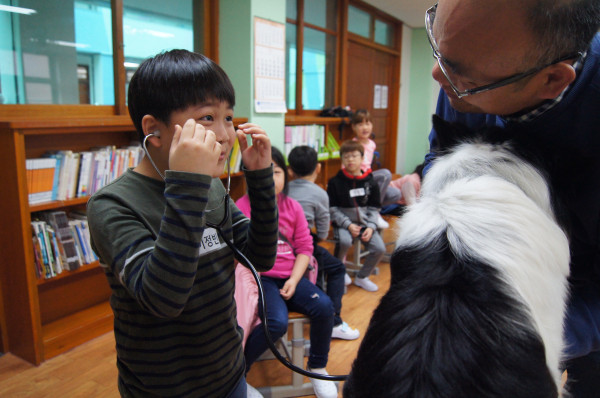 경기 오산시는 (사)나눔바이러스의 지원으로 오는 6월7일까지 대호·운천·성산·오산원당·운암 초등학교 등 지역내 5곳을 대상으로 ‘반려동물 매개 생명존중 교육 프로그램’을 운영한다. 사진은 최근 진행된 교육에 참여한 초등학생이 강아지를 진찰하는 체험을 하는 모습. (사진제공=오산시청)