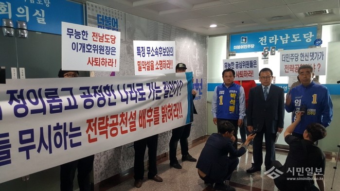 [신안=황승순 기자] 전남 신안군수 예비후보인 박석배·임흥빈 예비후보와 민주당 신안군 당원 및 예비후보 지지자들 100명이 25일 민주당 전남도당 사무실 찾아 불공정 경선 보류에 부당함을 주장하면서 정당한 경선일정을 요구하며 이개호 도당위원장과 사무처장 사퇴를 요구하는 항의집회를 가졌다.