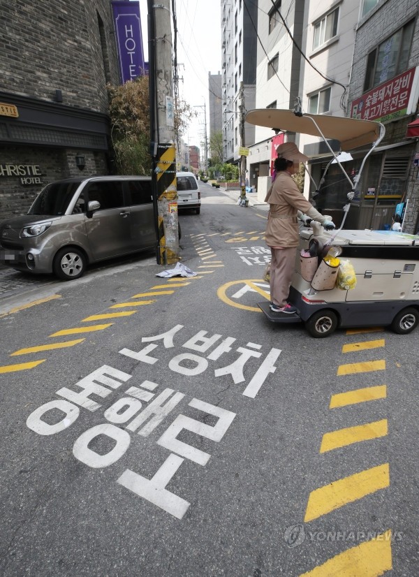 26일 오후 서울 중구의 한 골목 소방차 통행로 표지가 시인성과 가독성을 개선한 '소방활동 전용구역 노면표지 표준형 디자인'으로 적용돼 있다.
