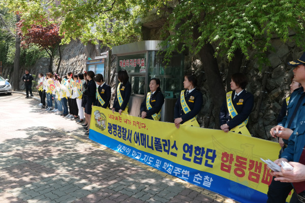 경기 광명시연합어머니폴리스는 지난 25일 광명초등학교 앞에서 학생, 시민, 경찰관 등 50여명이 참석한 가운데 학교 폭력예방 캠페인을 진행했다. 사진은 참여자들이 캠페인을 진행하는 모습. (사진제공=광명시청)