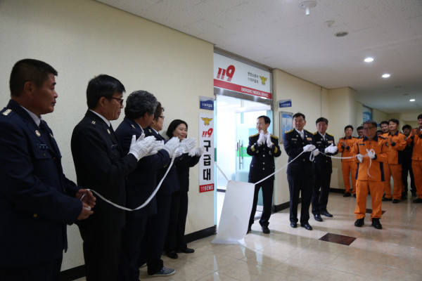 경기 연천소방서에서는 26일 오후 조경현 소방서장을 비롯한 소방공무원과 의용소방대 등 60여명이 참석한 가운데 119구급대 발대식을 개최했다. 사진은 참여자들이 현판 제막식을 진행하는 모습. (사진제공=연천소방서)