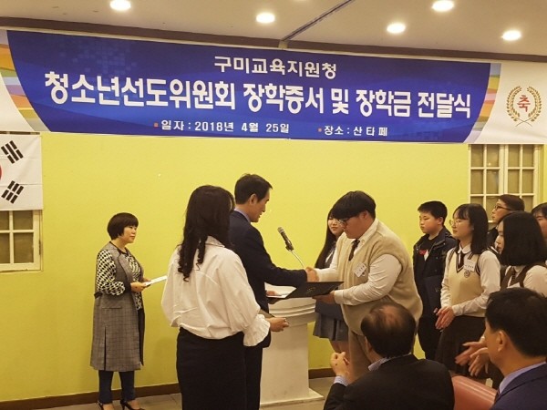 경북 구미교육지원청 청소년선도위원회는 최근 지역내 중·고등학교에서 추천받은 장학생 10명에게 장학금 400만원을 전달했다. 사진은 구미교육지원청 교육장이 학생에게 장학금을 전달하는 모습.(사진제공=구미교육지원청)
