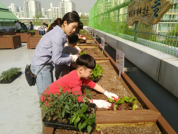 서울 노원구 공릉2동 소재 ‘책이랑 친구랑 작은도서관’은 도서관을 이용하는 학생과 학부모 9개팀 19명과 함께 공릉2동 주민센터 옥상 텃밭에 모종 1500개를 식재하는 행사를 개최했다. 사진은 행사에 참여한 한 어린이가 모종을 식재하고 있는 모습. (사진제공=노원구청)