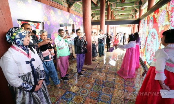 30일 오전 서울 경복궁에서 열린 궁중문화축전 행사에서 외국인들이 기념촬영을 하고 있다.