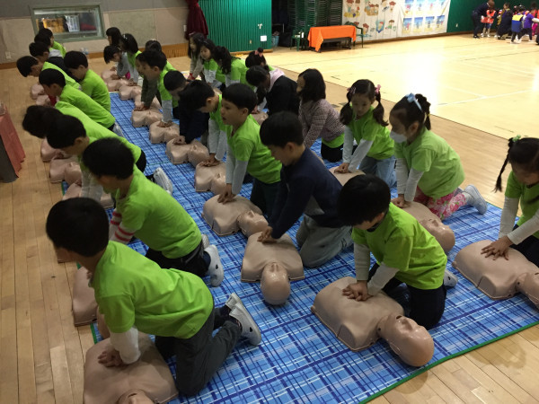 송파구는 오는 11월까지 지역내 초등학생 1만2000여명을 대상으로 '찾아가는 어린이 안전체험캠프'를 운영한다. 사진은 캠프에 참여한 초등학생들이 심폐소생술 실습을 하고 있는 모습. (사진제공=송파구청)