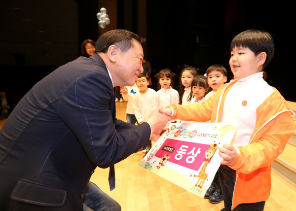 금천구는 최근 금나래아트홀 공연장에서 제8회 ‘나도스타’ 노래부르기 대회를 개최했다. 사진은 대회에서 동상을 받은 어린이가 구청장과 악수하고 있는 모습. (사진제공=금천구청)