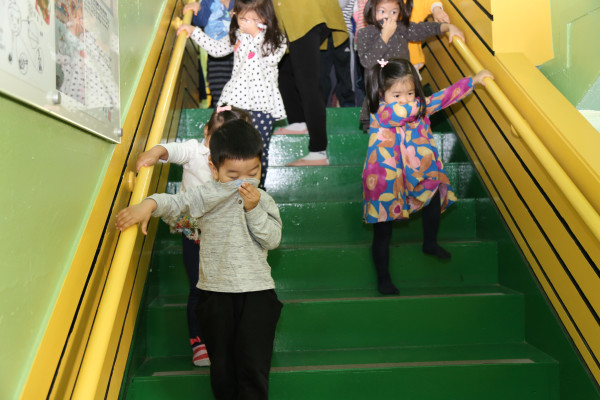 서울 영등포소방서는 30일 오전 여의도동 소재 성요셉유치원 원아들과 교사들을 대상으로 소방안전교육을 실시했다. 사진은 어린이들이 화재가 발생했을 때 대피하는 체험을 하고 있는 모습. (사진제공=영등포소방서)