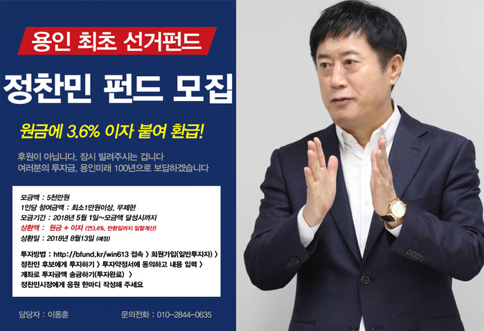 이번 펀드 모집은 투명하고 공개적인 선거자금을 모금해 시민들의 정치참여를 강조하기 위한 것으로, 용인지역에서 정치인이 ‘선거펀드’를 개설하는 것은 정 시장이 처음이다.