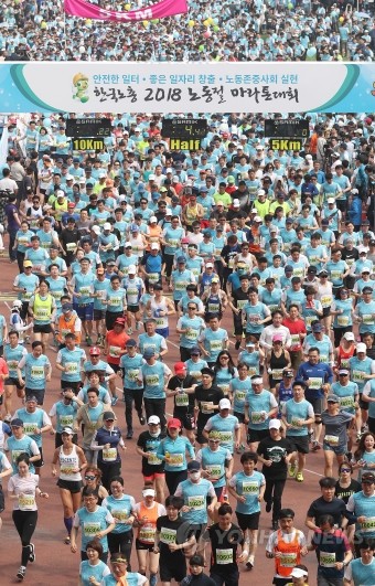 1일 서울 송파구 잠실 올림픽 주경기장에서 열린 '한국노총 2018 노동절 마라톤대회'에서 참가자들이 힘찬 출발을 하고 있다.