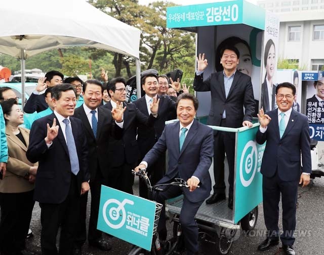 바른미래당 서울시장 안철수 후보가 2일 국회 헌정기념관 앞에서 열린 ‘바른미래당 돈 안 쓰는 선거 실천대회 및 알뜰 유세차 전시회’에서 박주선 공동대표, 이학재 의원 등과 함께 알뜰 유세차를 시승하고 있다.