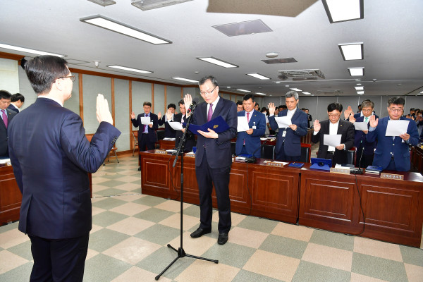 송파구는 2일 구청 3층 대회의실에서 6.13 지방선거에 대한 ‘공무원 선거중립 다짐 결의대회’를 개최했다. 사진은 구 간부공무원들이 선서를 하고 있는 모습. (사진제공=송파구청)