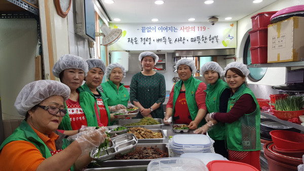 경기 수원시 권선구 평동 새마을부녀회 회원들은 지난 1일 '사랑의 반찬 만들기 행사'를 했다. 이날 회원 10여명은 안심메추리알장조림, 참나물무침, 고춧잎장아찌, 미역줄기볶음 등의 영양이 가득한 반찬을 만들었다. 사진은 참여자들이 기념촬영을 하는 모습. (사진제공=권선구청)