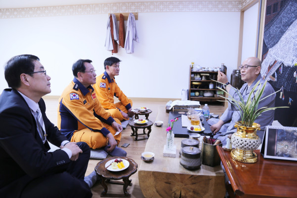 서울 종로소방서는 2일 종로구 소재 조계사에서 석가탄신일 대비 소방안전대책 일환으로 화재안전컨설팅을 실시했다. 사진은 소방서 관계자들이 스님과 이야기를 나누는 모습. (사진제공=종로소방서)