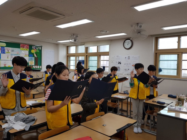 경기 화성시 중독통합관리지원센터가 2일 한백초등학교에서 6학년 학생 21명으로 구성된 ‘아웃터넷 서포터즈’ 발대식을 개최했다. 서포터즈는 오는 11월까지 건강한 인터넷 및 스마트폰 사용법을 알리는 역할을 한다. 사진은 이번에 임명된 학생들이 선서를 하는 모습. (사진제공=화성시청)