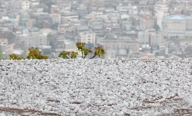 서울 지역에 소나기가 내린 3일 오후 서울 남산 N타워 전망대를 향하는 길에 우박 얼음 알갱이들이 쌓여 있다.